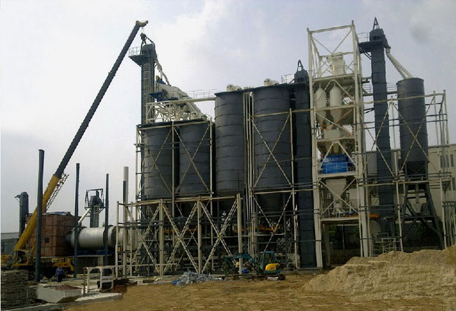 主要由提升輸送系統、計量配料系統、混合系統、儲料系統、包裝系統、除塵系統、控制系統、鋼架平臺等組成。